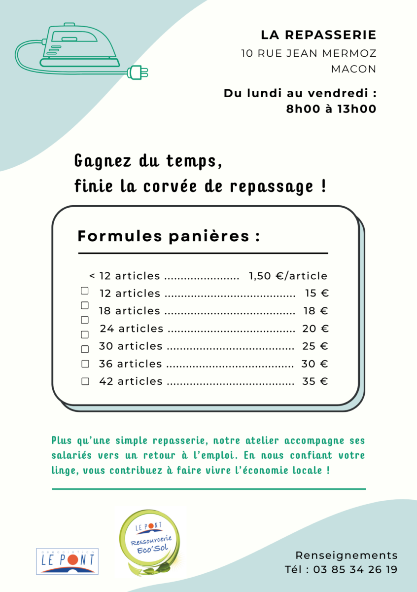 La Ressourcerie Eco’Sol de Mâcon vous propose un service de repassage.