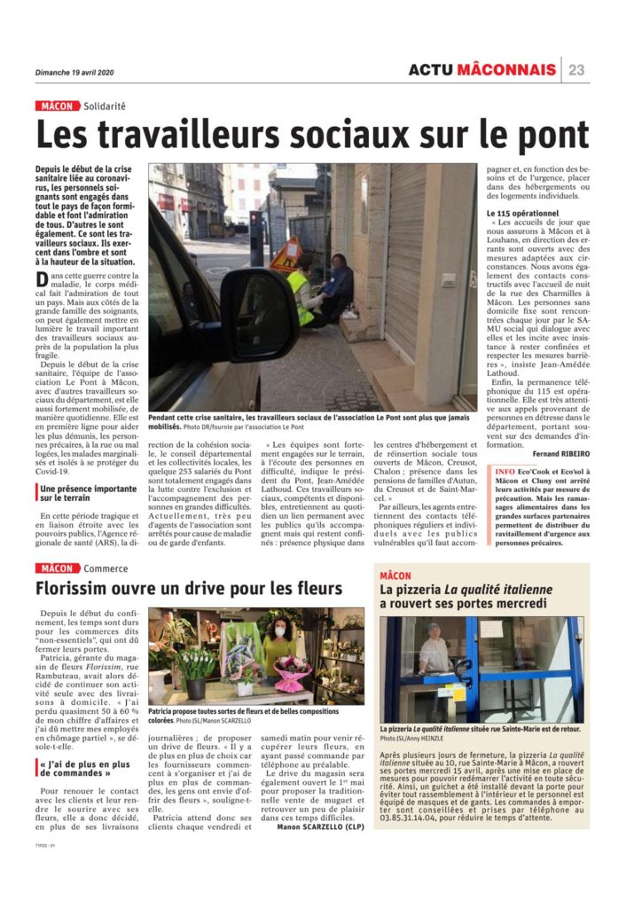 Les travailleurs sociaux sur le pont SOURCE : article du JSL – par Fernand RIBEIRO – du 18/04/2020 Perrine PERRIN2020-04-20T08:46:31+02:00lundi 20 avril 2020| Articles similaires 07/01/2026 : Françoise Michon, ou « mamie gâteaux », est décédée : « C’est une perte immense pour les gens de la rue » 07/01/2026 : Françoise Michon, ou « mamie gâteaux », est décédée : « C’est une perte immense pour les gens de la rue » vendredi 9 janvier 2026 31/12/25 : Élus et préfecture ont fait la tournée des services sur le pont le soir du réveillon 31/12/25 : Élus et préfecture ont fait la tournée des services sur le pont le soir du réveillon lundi 5 janvier 2026 Hommage à Françoise MICHON Hommage à Françoise MICHON lundi 5 janvier 2026 Meilleurs voeux 2026 Meilleurs voeux 2026 jeudi 1 janvier 2026 13/12/2025 : Le Père Noël est un Rockeur ! 13/12/2025 : Le Père Noël est un Rockeur ! mardi 16 décembre 2025