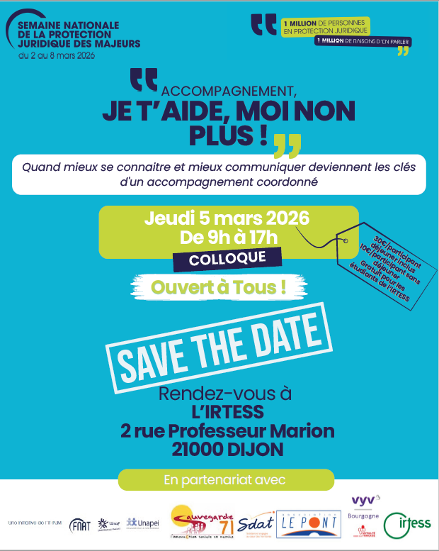 Colloque « Accompagnement, je t’aide, moi non plus » + Ajouter à mon Agenda Google + iCal / Outlook export 00 jours 00 heures 00 minutes 00 secondes Date Mar 05 2026 Heure 9 h 00 min - 17 h 00 min Lieu IRTESS DIJON (21) Partagez cet événement