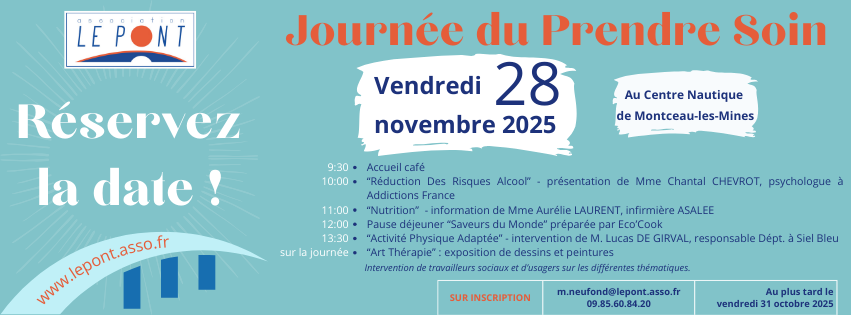 Journée du Prendre Soin + Ajouter à mon Agenda Google + iCal / Outlook export 00 jours 00 heures 00 minutes 00 secondes Date Nov 28 2025 Heure 9 h 30 min - 19 h 00 min Lieu Montceau-les-Mines Partagez cet événement
