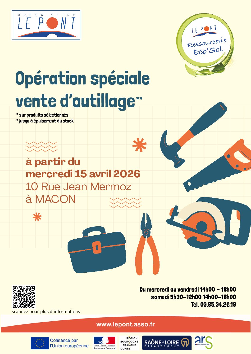 Opération spéciale vente d’outillage chez Eco’Sol Mâcon + Ajouter à mon Agenda Google + iCal / Outlook export 00 jours 00 heures 00 minutes 00 secondes Date Avr 15 - 30 2026 Heure 14 h 00 min - 18 h 00 min Lieu Ressourcerie Eco'Sol Mâcon (71) Partagez cet événement