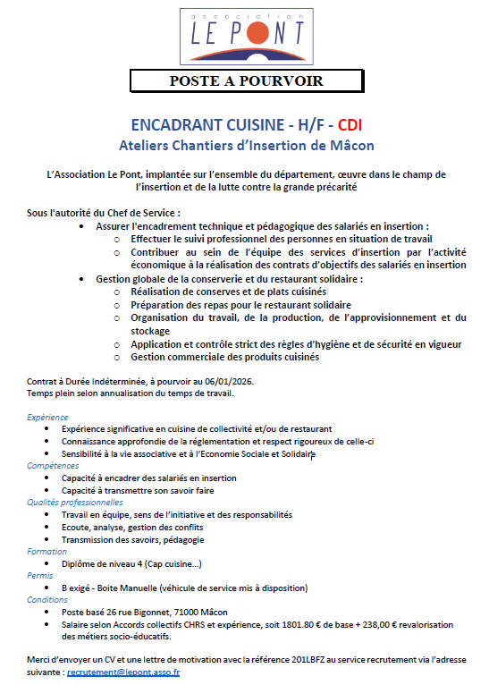 ENCADRANT CUISINE – H/F – ACI – Réf : 201LBFZ Sociaux Educatifs Mâcon Publié il y a 1 jour Perrine PERRIN2025-12-11T15:47:31+01:00jeudi 11 décembre 2025|