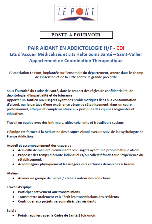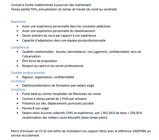 PAIR AIDANT EN ADDICTOLOGIE H/F – LAM-LHSS-ACT – Réf : 200DFNN Sociaux Educatifs Montceau-les-Mines Publié il y a 1 mois Perrine PERRIN2025-12-05T11:32:03+01:00vendredi 7 novembre 2025|