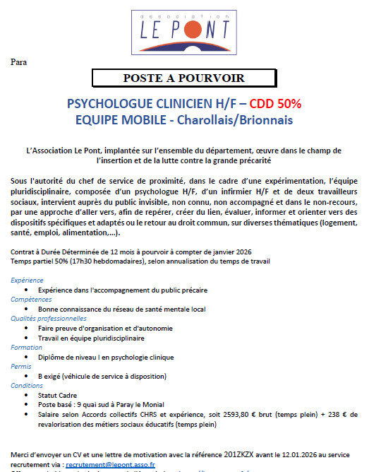 PSYCHOLOGUE CLINICIEN H/F – EMMR – Réf : 201ZKZX Sociaux Educatifs Paray le Monial Publié il y a 3 semaines Perrine PERRIN2026-01-05T10:34:56+01:00lundi 5 janvier 2026|