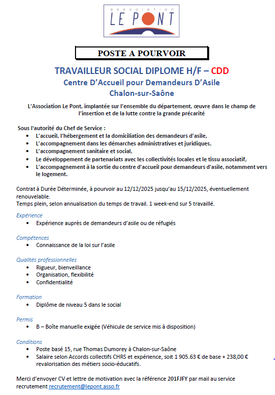 TRAVAILLEUR SOCIAL DIPLOME H/F – CADA – Réf : 201FJFY Sociaux Educatifs CHALON SUR SAONE Publié il y a 5 jours Perrine PERRIN2025-12-05T11:30:32+01:00vendredi 5 décembre 2025|