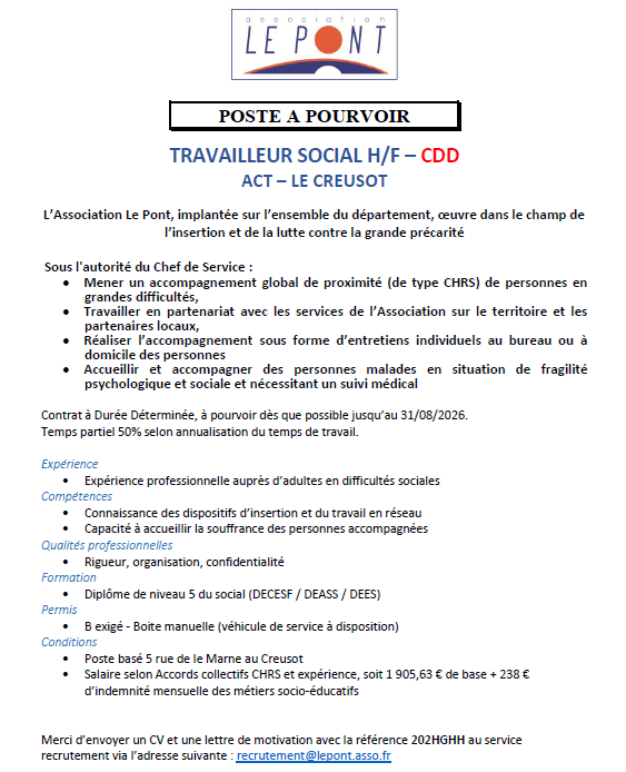 TRAVAILLEUR SOCIAL H/F – ACT – Réf : 202HGHH Sociaux Educatifs LE CREUSOT Publié il y a 2 semaines Perrine PERRIN2026-01-08T09:22:59+01:00jeudi 8 janvier 2026|