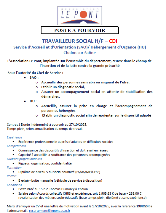 TRAVAILLEUR SOCIAL H/F – SAO-HU – Réf : 198RGSR Sociaux Educatifs Chalon-sur-Saône Publié il y a 1 mois Perrine PERRIN2025-11-03T15:55:04+01:00lundi 6 octobre 2025|